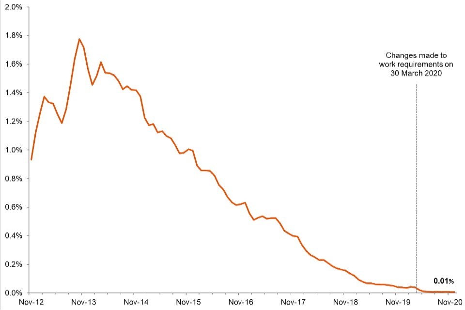 In December 2020, 0.01% of people on JSA had a deduction taken from their payment as a result of a sanction.