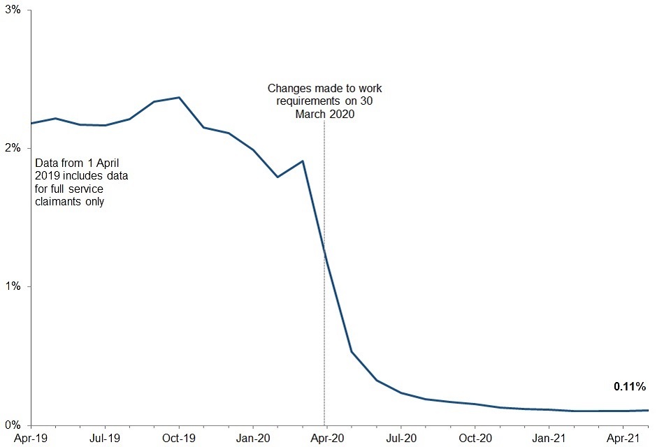 - prior to legislation changes made on 30 March 2020, 1.91% of UC full service claimants subject to conditionality at the point where the sanction was applied had a deduction taken from their UC full service award as a result of a sanction. In May 2021, this proportion was 0.11%. This is: