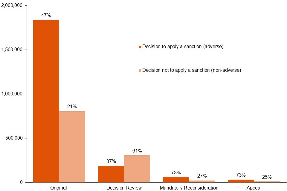 Within this publication, we refer to all of these outcomes as decisions. Many sanction decisions can be made during the course of a claim where the claimant has failed to meet the conditions of their benefit claim more than once.