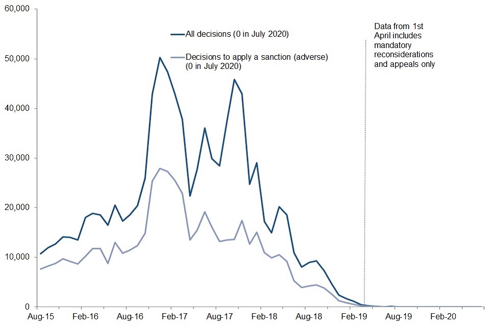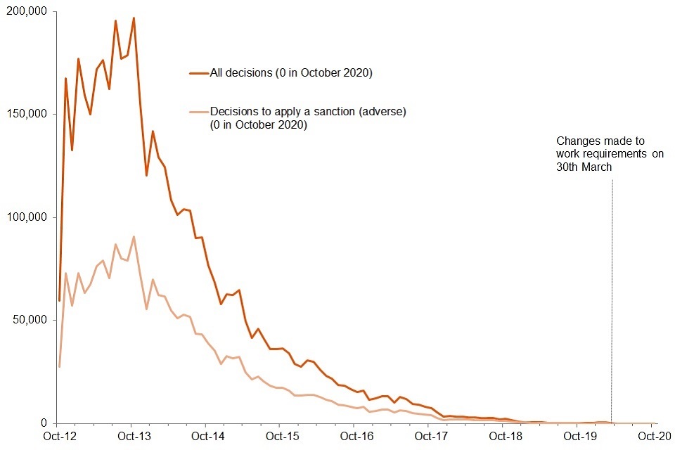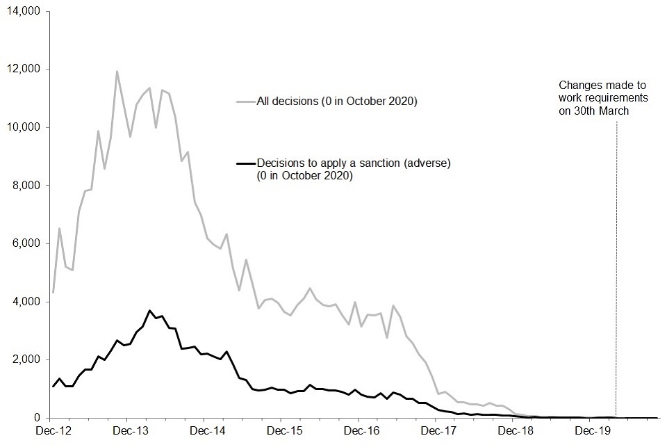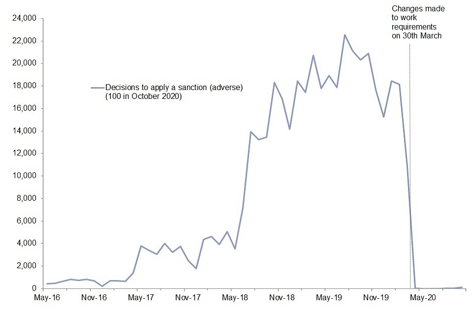 The numbers of adverse sanction decisions reached a peak in July 2019 after following an upward trend as UC full service was rolled out and the UC caseload built up. In March 2020 the number of adverse sanction decisions decreased to 11,000. The number of adverse sanction decisions continued to drop following the legislative changes to work requirements on 30 March (in response to the coronavirus (COVID-19) pandemic).