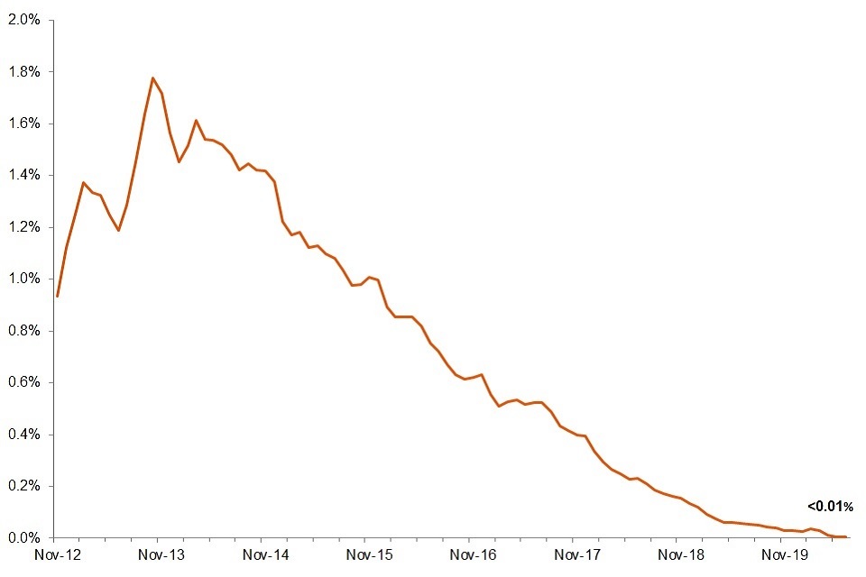 - has decreased from 81% in August 2015 to 59% in March 2020, and has since been fluctuating between 61% and 67%