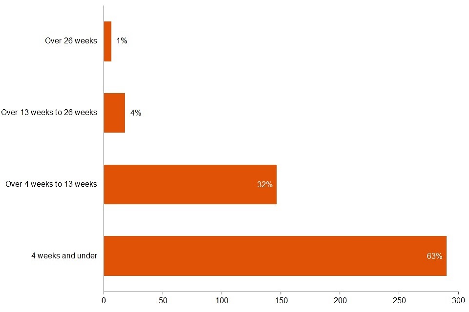 81% of ended ESA (WRAG) sanctions lasted 13 weeks or less since December 2012. The average (median) ESA (WRAG) sanction lasted 28 days. See the methodology document for further information on why a median has been used.