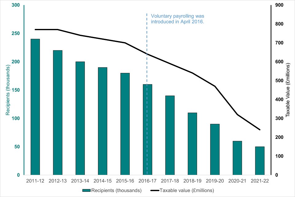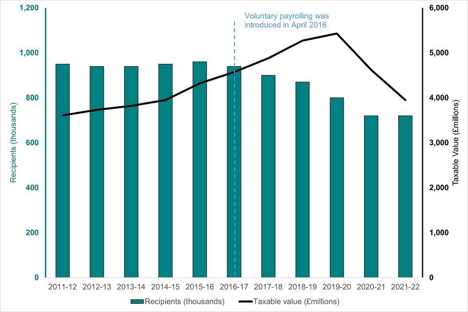 There has been a long-term downward trend in both the number of recipients and the total taxable value of car fuel from 240,000 recipients (taxable value £770 million) in tax year 2011 to 2012 to 50,000 recipients (taxable value £240 million) in 2021 to 2022.