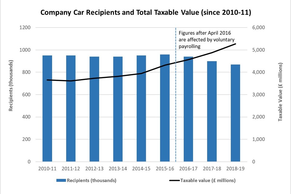 comparisons over time are made difficult by incompleteness arising from the introduction of voluntary payrolling in April 2016. For two years (2016 to 2017 and 2017 to 2018) there was no requirement to report voluntarily payrolled cars. Reporting is now required, but there is still under-reporting, and initial analysis suggests this may account for a large part of the reduction in cars since 2015 to 2016