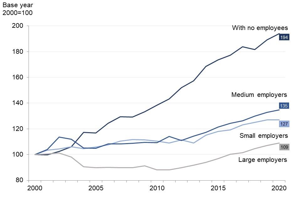 Between 2000 and 2020 increases in numbers of non-employing businesses has been far larger than the increase in numbers of employing businesses.