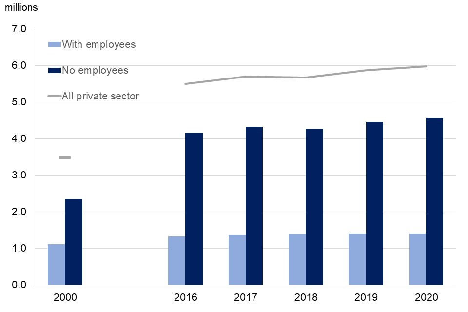 Figure 5: Non-employing and employing businesses in the UK private sector, 2000 and 2016 to 2020