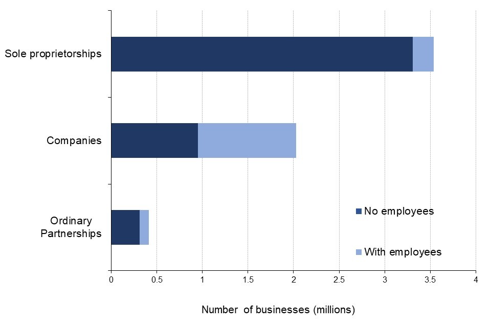 The vast majority of sole proprieterships and ordinary partnerships have no employees, whilst over half companies are employers.