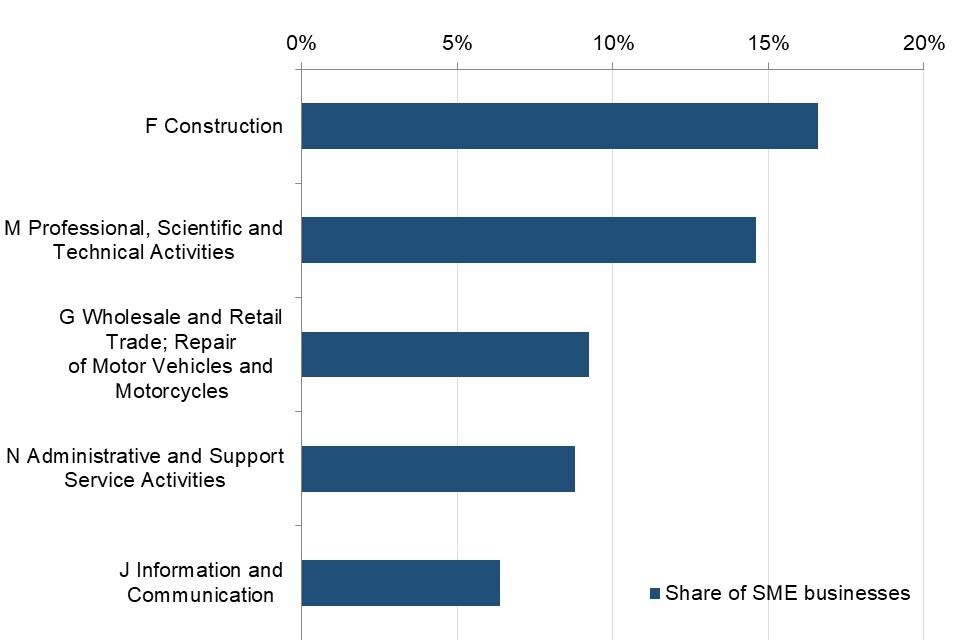 - there were also a considerable number of SMEs operating in the Professional, Scientific and Technical Activities (872,000 or 15%), and Wholesale and Retail Trade and Repair sectors (552,000 or 9%)