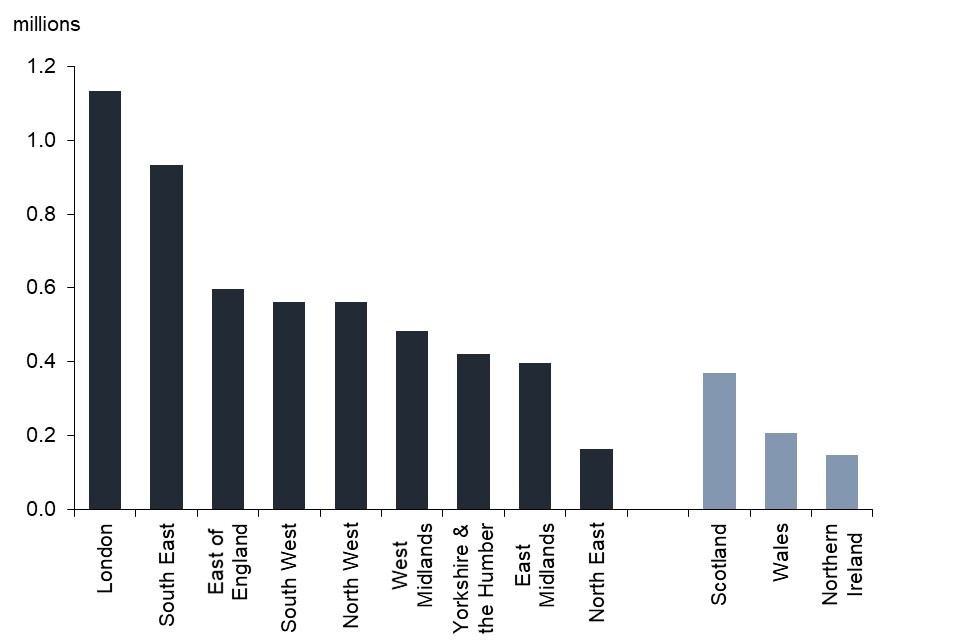 Figure 11: Estimated private sector businesses numbers in each English region, Scotland, Wales and Northern Ireland, with 95% CIs, start of 2020