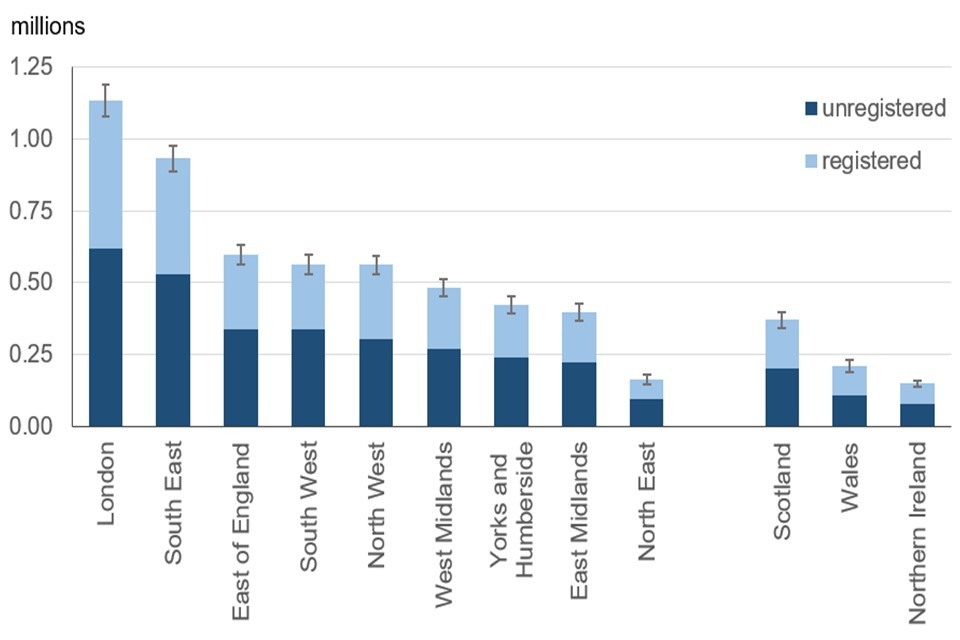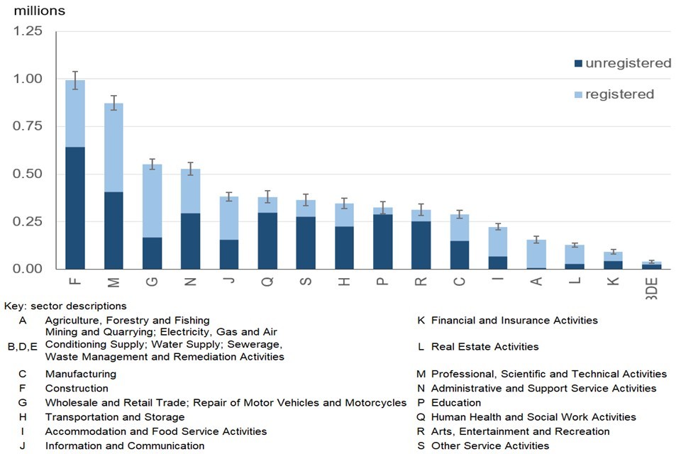 - 3.3 million businesses (56%) traded without being registered for VAT or PAYE and are classified here as ‘unregistered’