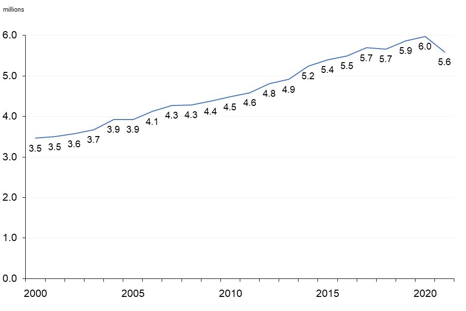 Numbers of UK businesses increased from 3.5 million in 2000 to 6.0 million in 2020, then decreased to 5.6 million in 2021
