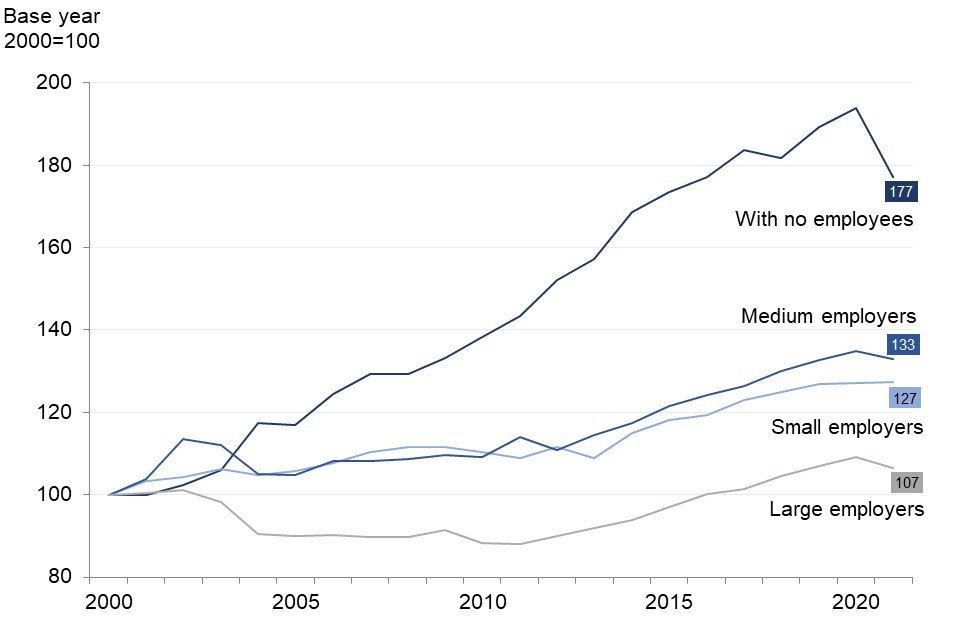 - the number of non-employing businesses has increased by 1.8 million (77%)