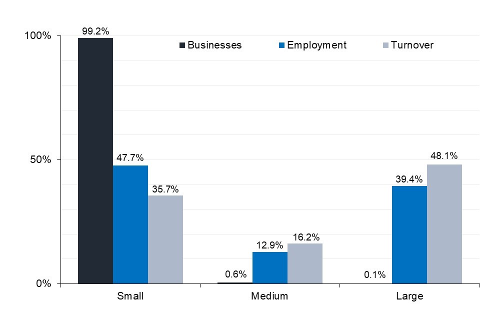 Small businesses account for over 99.9% of businesses, whilst accounting for nearly half of employment and over a third of turnover