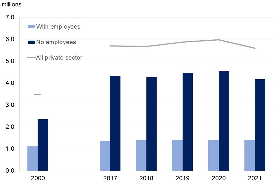 - there were 3,000 more (0.2%) employing businesses and 393,000 fewer (8.6%) non-employing businesses