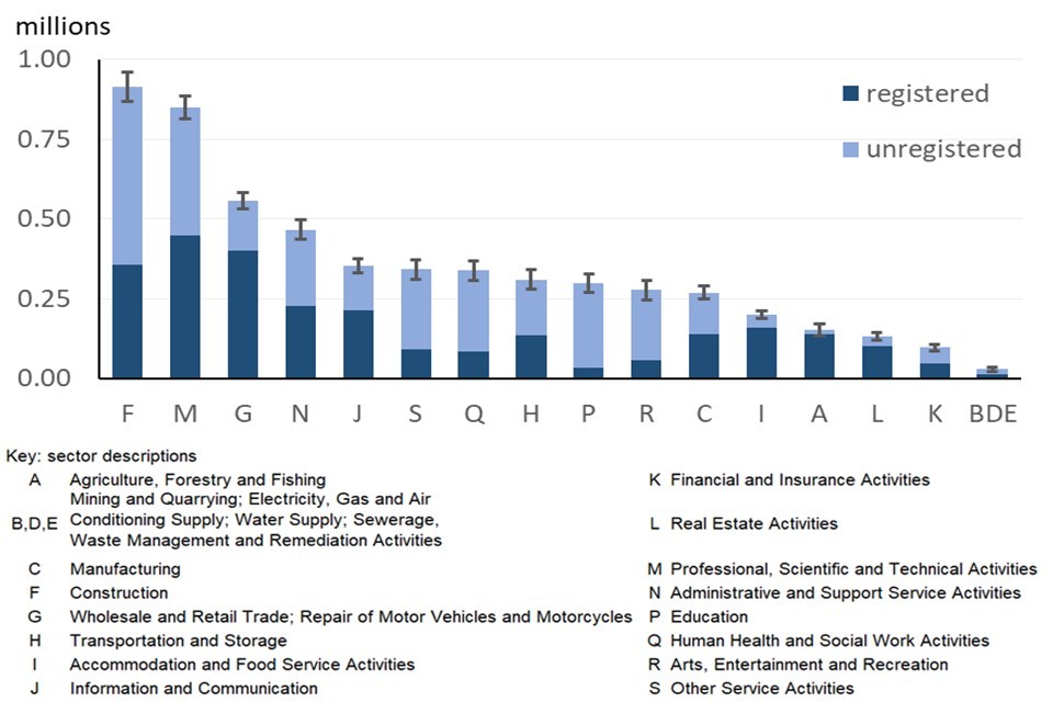 - there were decreases in the number of businesses in the majority of industrial sectors, primarily due to a reduction in the unregistered business population. The greatest numeric decrease was in Construction (79,000). The greatest percentage decrease was in the combined sector ‘Mining and Quarrying; Electricity, Gas and Air Conditioning Supply; Water Supply; Sewerage, Waste Management and Remediation Activities’ (26%)