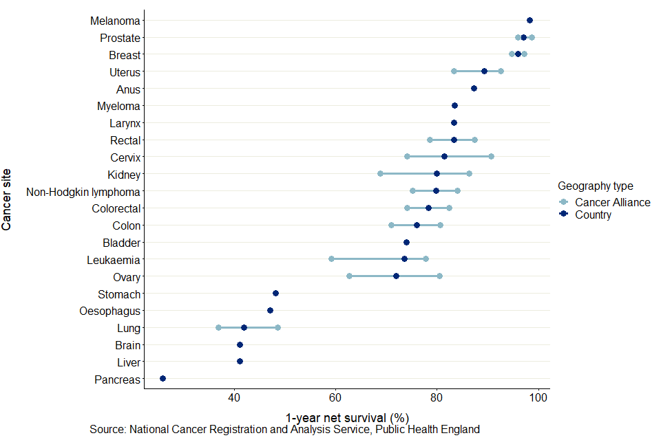 Across the 22 cancer sites, the CA with the largest difference between cancer sites in 1-year survival estimates was Lancashire and South Cumbria CA, a difference of 75.9 percentage points from 21.9% for pancreas cancer to 97.8% for melanoma.