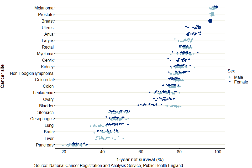 Figures 1 and 2 were ordered by 1-year net survival. They show the pattern of cancers from high to low 5-year net survival estimates are not always the same as for 1-year net survival, or between males and females. Melanoma of the skin had the highest survival estimate of all cancers for both 1-year and 5-year survival, for both males and females. Pancreatic cancer had the lowest survival estimate of all cancers for 1-year, for both males and females. For 5-year survival, pancreatic survival was lowest for females, but mesothelioma was lowest for males. For melanoma of the skin, the 1-year survival estimate for males was 97.6% and for females was 98.8%, and the 5-year net survival estimates for males and females were 90.1% and 94.5% respectively. Pancreatic cancer had the lowest 1-year survival for males (25.3%) and females (26.6%) and 5-year survival for females (7.6%). Mesothelioma had the lowest 5-year survival for males (6.7%).