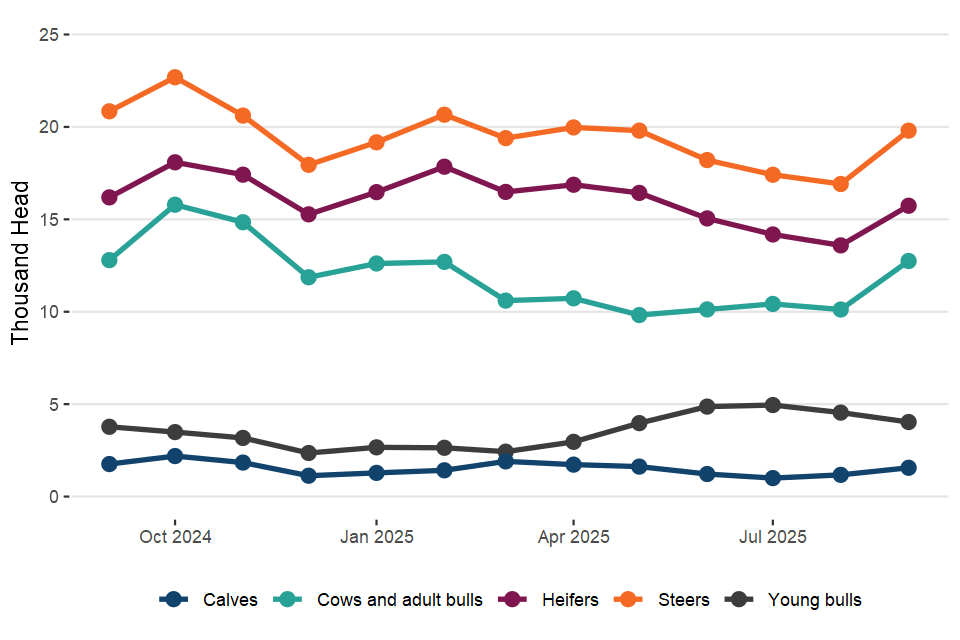 UK prime cattle (steers, heifers and young bulls) slaughterings in September 2025 were down 3% on September 2024 at 170,000 head. Beef and veal production was 76,000 tonnes, 1% lower than in September 2024. (Figure 2.1)