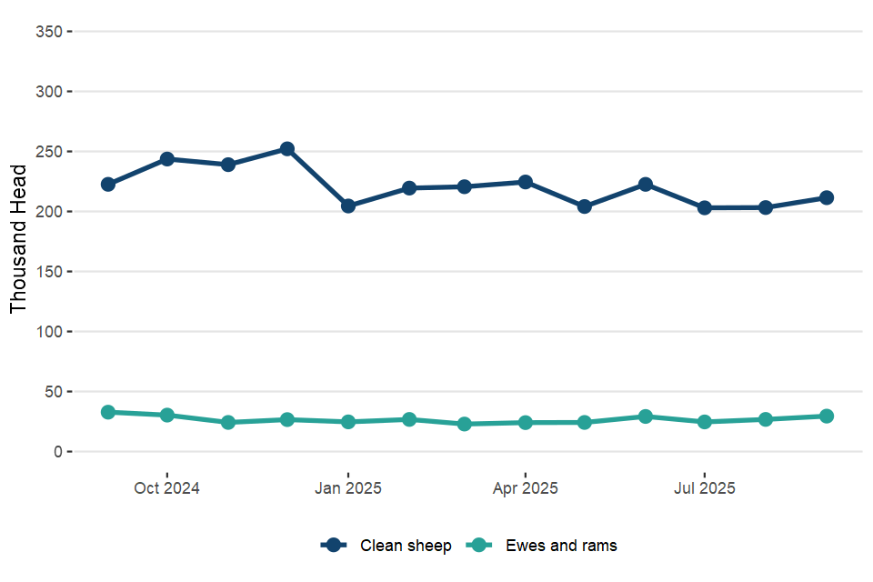 UK clean sheep slaughterings were down 5% on September 2024 at 906,000 head. Mutton and lamb production was 21,000 tonnes, 4.4% lower than in September 2024.(Figure 2.3)