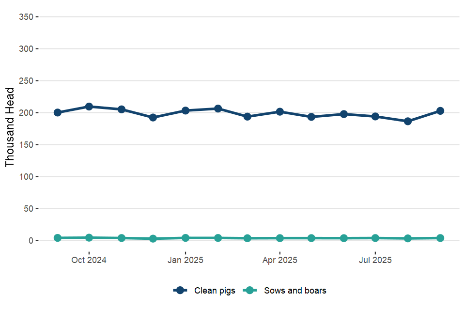 UK clean pig slaughterings were up 1.3% on September 2024 at 869,000 head. Pigmeat production was 81,000 tonnes, 2% higher than in September 2024.(Figure 2.3)