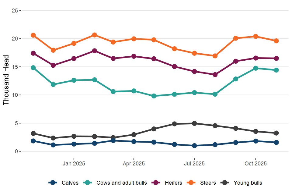 UK prime cattle (steers, heifers and young bulls) slaughterings in November 2025 were down 4.5% on November 2024 at 169,000 head. Beef and veal production was 78,000 tonnes, 2.2% lower than in November 2024. (Figure 2.1)