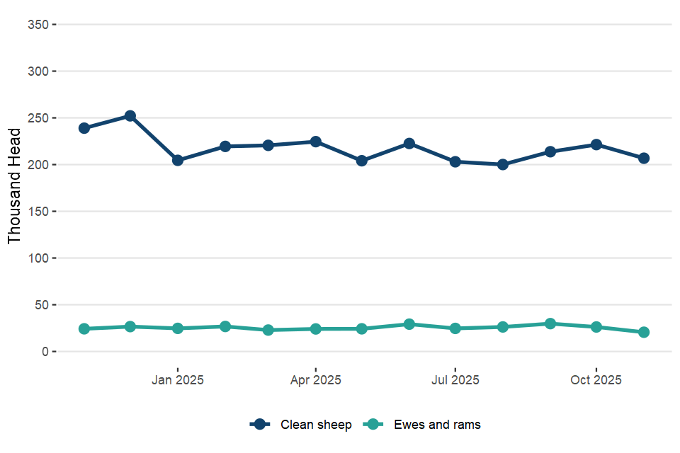 UK clean sheep slaughterings were down 13% on November 2024 at 886,000 head. Mutton and lamb production was 20,000 tonnes, 12% lower than in November 2024.(Figure 2.3)