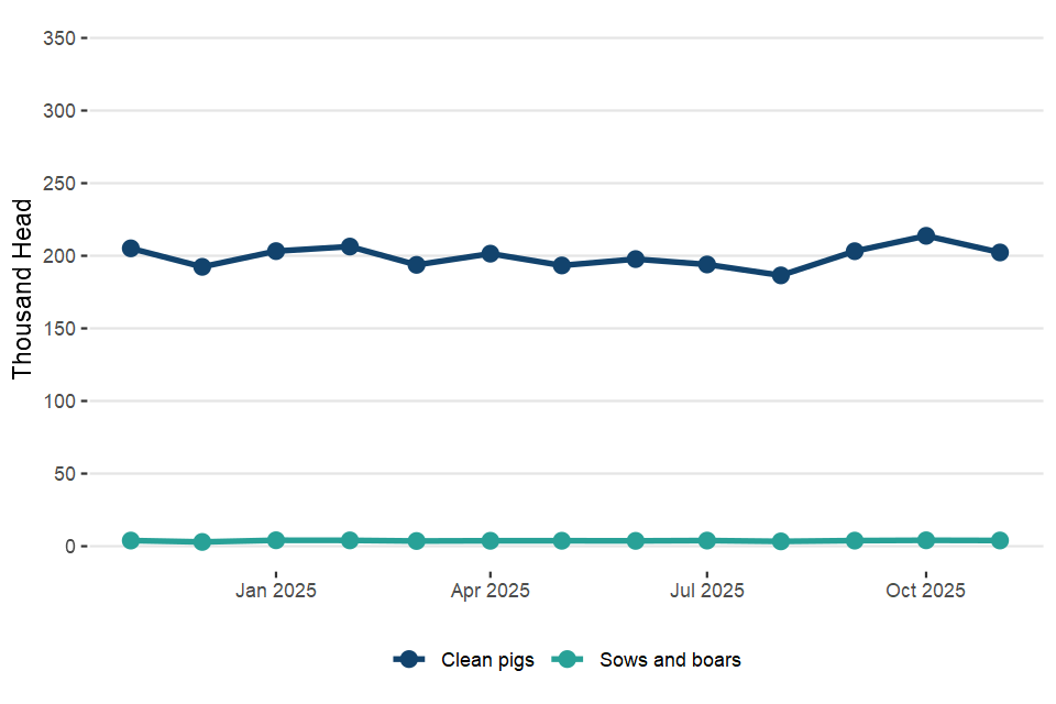 UK clean pig slaughterings were down 1.4% on November 2024 at 867,000 head. Pigmeat production was 83,000 tonnes, 1.2% higher than in November 2024.(Figure 2.3)