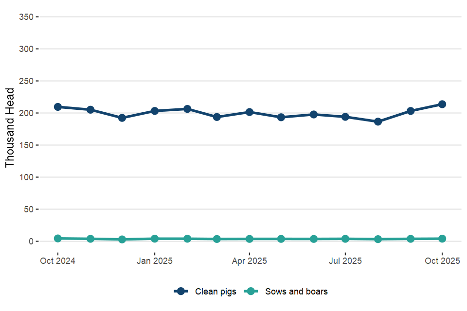 UK clean pig slaughterings were up 2% on October 2024 at 946,000 head. Pigmeat production was 90,000 tonnes, 3.8% higher than in October 2024.(Figure 2.3)