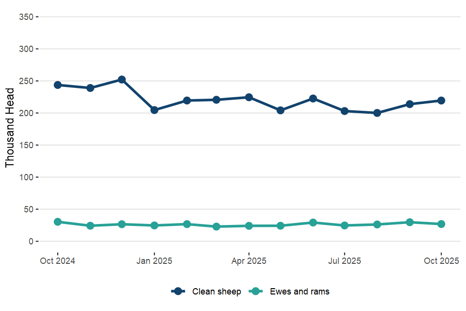 UK clean sheep slaughterings were down 9.9% on October 2024 at 972,000 head. Mutton and lamb production was 23,000 tonnes, 8.3% lower than in October 2024.(Figure 2.3)