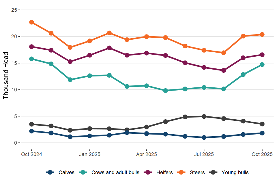 UK prime cattle (steers, heifers and young bulls) slaughterings in October 2025 were down 8.6% on October 2024 at 179,000 head. Beef and veal production was 83,000 tonnes, 6.1% lower than in October 2024. (Figure 2.1)