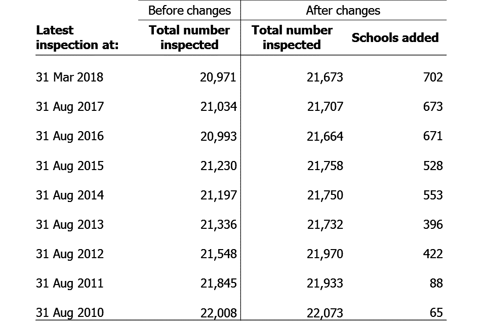 The official statistics dataset included a list of all open schools (around 22,000 schools), but the latest inspection outcomes were missing for around 1,000 of these schools. Following the methodology change the latest inspection outcomes of 702 schools have now been added into the dataset. This means that 3% more schools now have a latest inspection outcome reported, both in the underlying dataset and in all associated analysis.