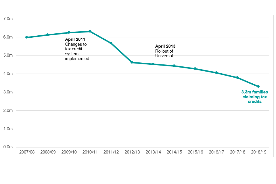 The rate of decline in the number of families receiving tax credits increased in 2018-19, largely due to the roll out of Universal Credit. From 1 January new claims for tax credits were closed except for a small number of cases [footnote 2] .