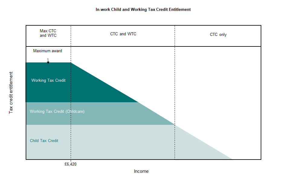 If a household is out-of-work and therefore eligible for the CTC only, they will receive the full entitlement until their annual household income reaches £16,105 (2018-19). After this point, the amount of tax credits they receive is again reduced by 41 pence for each additional £1 of income beyond this threshold (note that this is not shown on the diagram below).