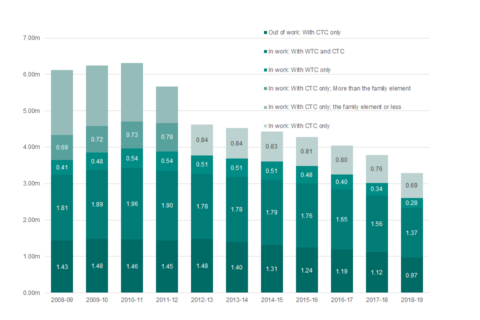 The number of in-work families claiming both Working Tax Credit (WTC) and Child Tax Credit (CTC), which are awards with a higher average entitlement, steadily increased from 2008-09 and peaked in 2010-11 at 1.96 million. Subsequent years show a fall in the number of families claiming WTC and CTC and in 2018-19 it stood at 1.37 million.
