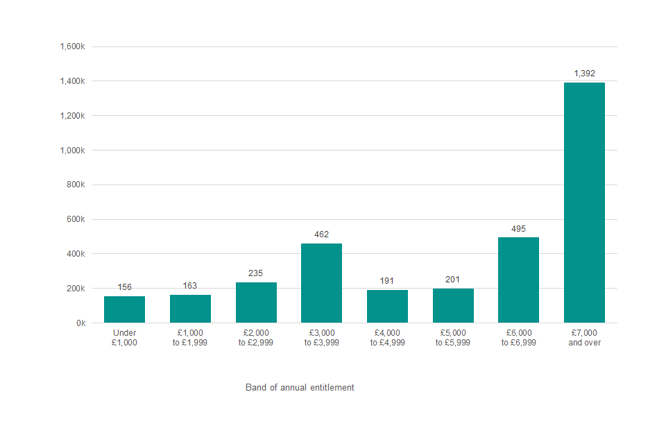 Figure 2.4 shows that the largest proportion of families’ (42%) entitlement are of the value of £7,000 and over, followed by families with an entitlement between £6,000 to £6,999 (15%).