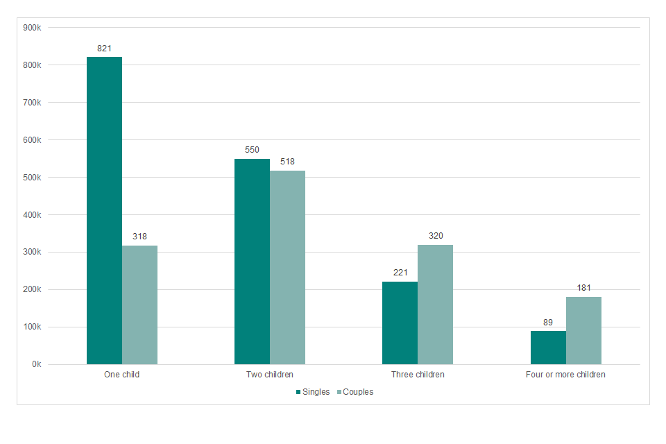 Figure 2.3 shows that the majority of families with children are made up of either one or two children with single parent families more likely to have one child than couples do. Couples are more likely to have larger family sizes. Out of approximately 270,000 families with four or more children, 67% are couples.