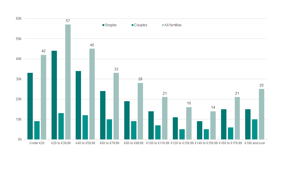 Figure 3.1 shows the average weekly support with childcare costs for single parent families, couples and across all families. The costs are broadly split across the cost bands for each of the categories, reflecting the range hours of childcare claimed. The largest category for both lone-parents and couples is £20 to £39.99, although the costs for couples are spread more evenly across the categories.