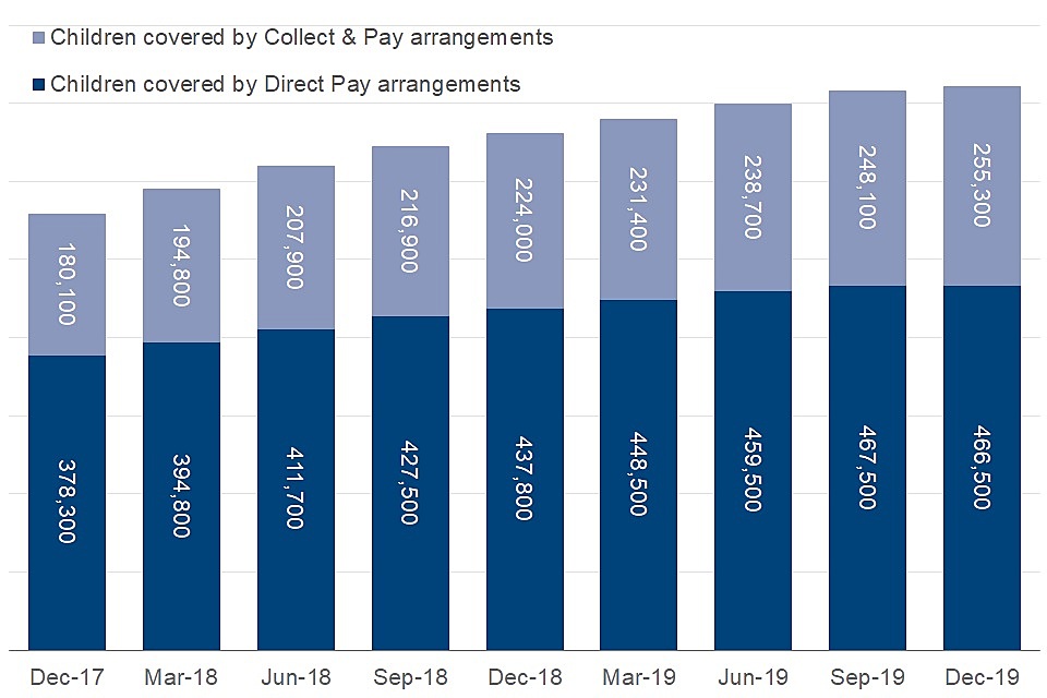 Chart shows 466,500 children were covered by Direct Pay and 255,300 children were covered by Collect and Pay for the quarter December 2019. 721,800 children were covered by both arrangements. This figure has steadily increased since December 2017