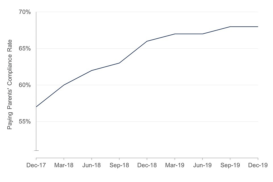 Chart shows Paying Parents compliance rate was 68% for the quarter December 2019. This has been increasing since the quarter December 2017. However, the high rate of improvement in this metric observed throughout 2018 has slowed down