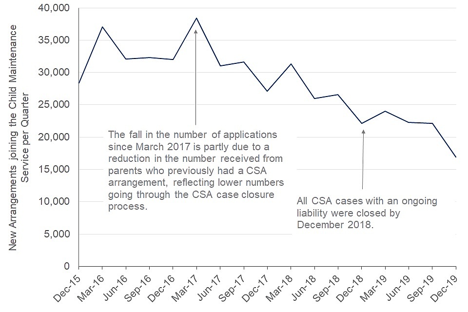 Some applications to the Child Maintenance Service are from: parents who previously had an arrangement with the Child Support Agency. All Child Support Agency cases with an ongoing liability were closed by December 2018, and parents were encouraged to make a new family-based arrangement or an arrangement through the Child Maintenance Service. However, the Child Maintenance Service may still receive applications from such parents, as they may have had a family-based arrangement in the interim.