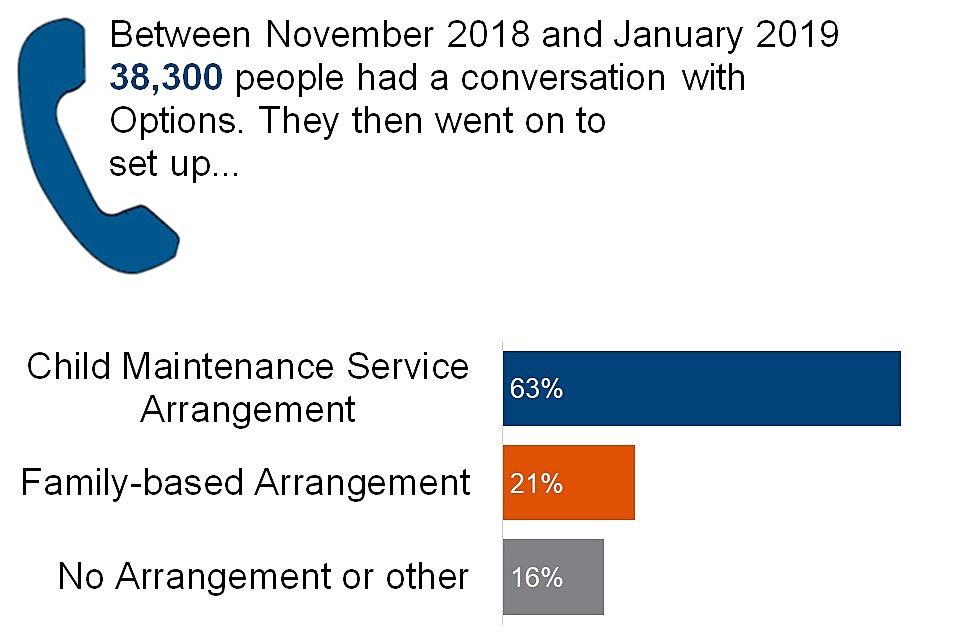 Chart shows that between November 2018 and January 2019 38,300 people spoke with Options. 63% went on to set up a Child Maintenance Service Arrangement, 21% went on to set up a Family-based Arrangement and 16% went on to set up No Arrangement or other