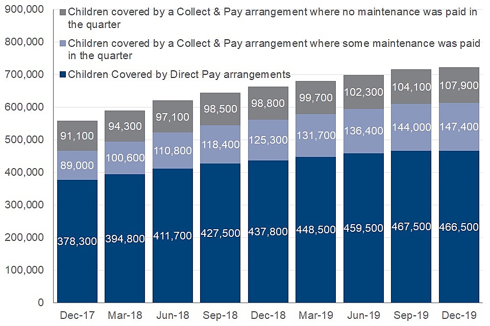 Chart shows for the quarter December 2019 466,500 children were covered by Direct Pay, 147,400 were covered by Collect and Pay where some maintenance was paid, 107,900 were covered by Collect and Pay were no maintenance was paid