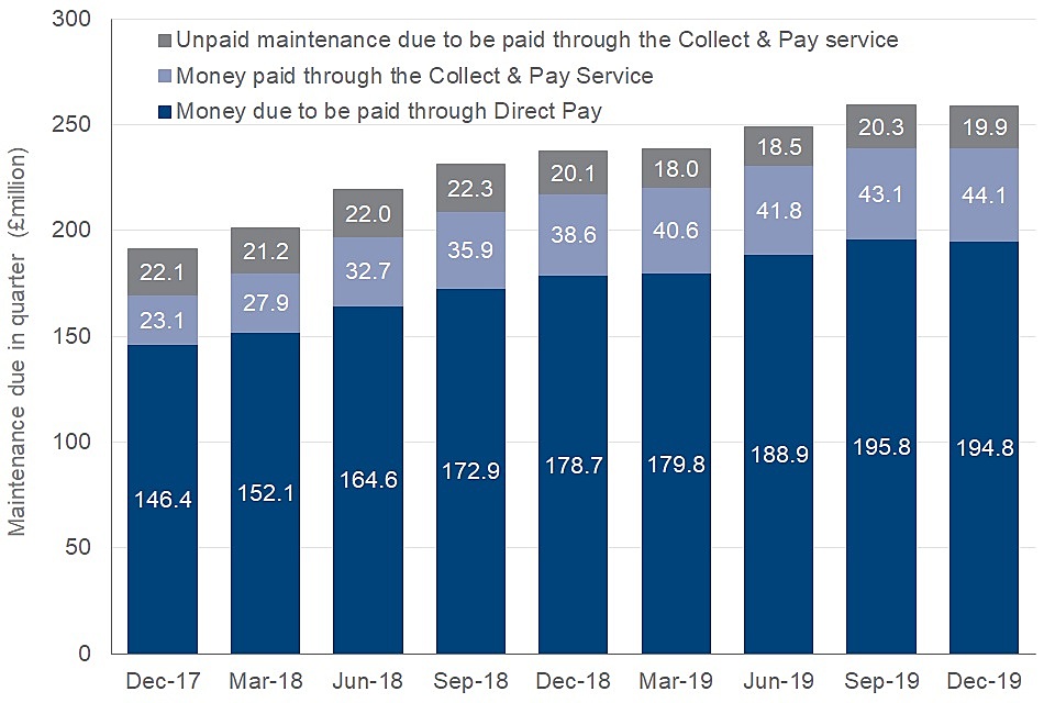 Chart shows £194.8 million was due to be paid through Direct Pay, £44.1 million was paid by Collect and Pay and £19.9 million was unpaid maintenance through Collect and Pay for the quarter December 2019
