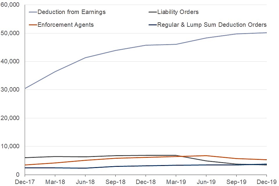 Chart shows that in the quarter December 2019 there were 50,200 Deductions from Earning Orders and Requests, 3,500 Liability Orders in process, 5,300 Enforcement Agent Referrals in process and 3,800 Regular and Lump Sum Deduction Orders in process