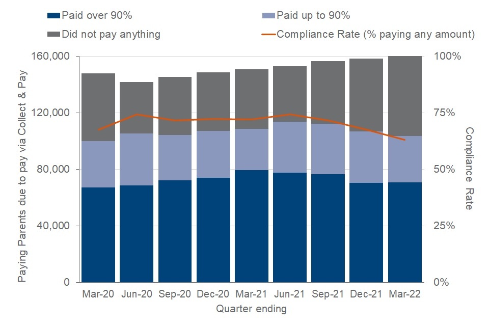 Compliance rate of Paying Parents on the Collect & Pay Service, quarters ending March 2020 to March 2022