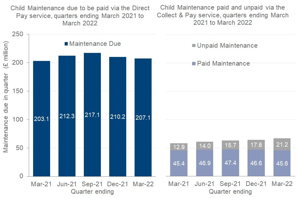 During the quarter ending March 2022, £273.9 million Child Maintenance was due to be paid either via the Direct Pay service or the Collect & Pay service.