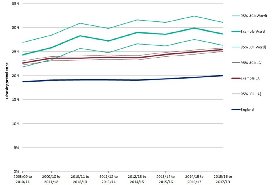Figure 2 shows the trend in obesity prevalence among Year 6 children for an example ward, compared to the local authority and England values. Obesity prevalence in this ward has been consistently higher than both the England and local authority values. Prevalence appears to be showing a pattern of increase in this ward with small increases and decreases year to year.