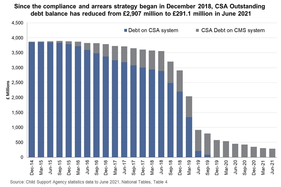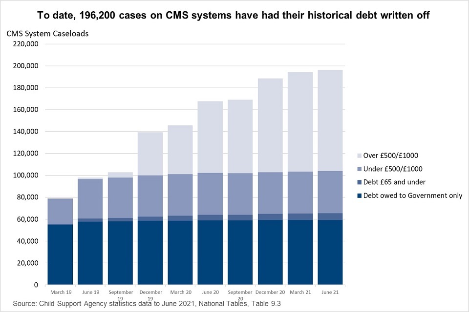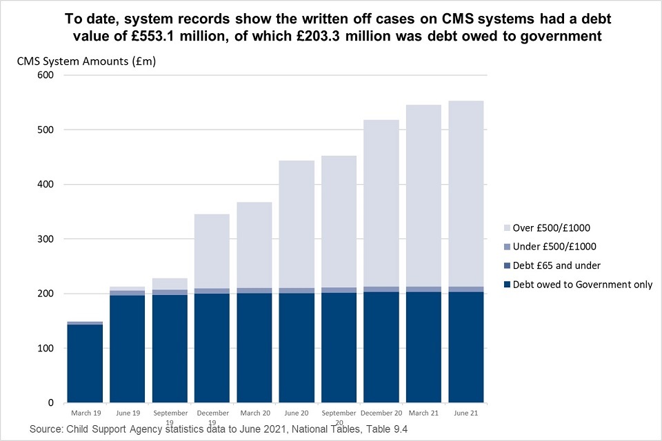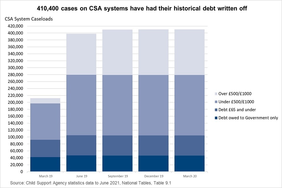 In 2018, the Compliance and Arrears Strategy was established which brought the estimated £3.7 billion of CSA child maintenance debt within scope of a write-off programme. At the time that the strategy consultation document was written, it was estimated that £2.5 billion was owed to parents with care (approximately 970,000 cases) and £1.2 billion was owed to the government (approximately 320,000 cases).