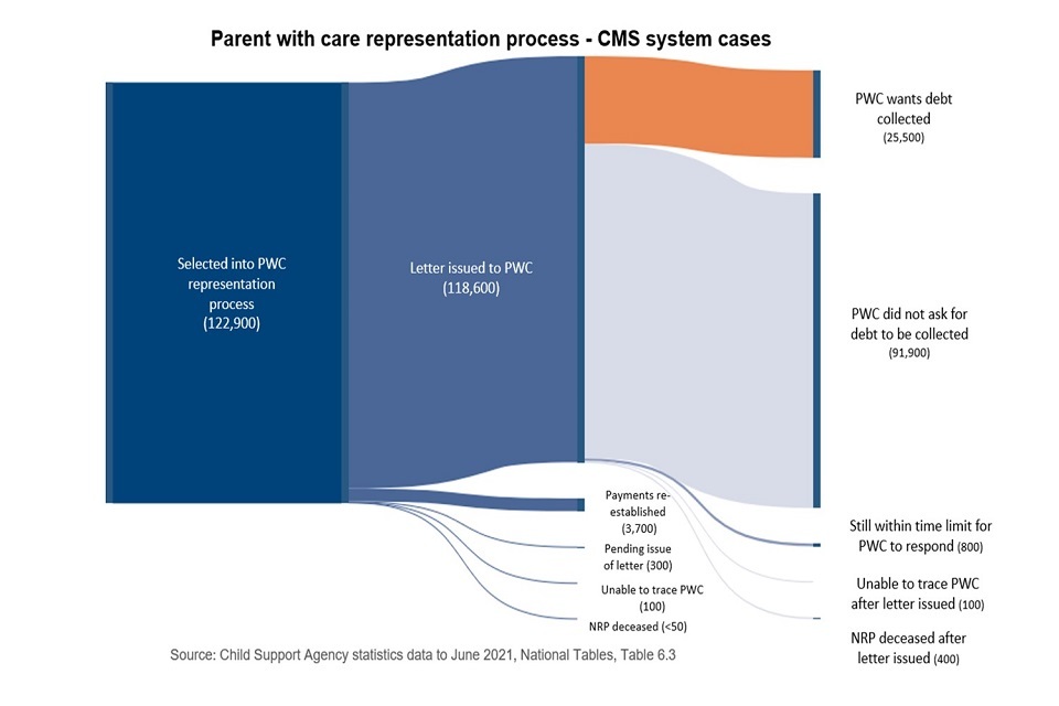 122,900 cases held on CMS systems and eligible for representation had started the parent with care representation process by the end of June 2021. The large scale selection of cases eligible for representation and write-off under the Compliance and Arrears Strategy is now complete.
