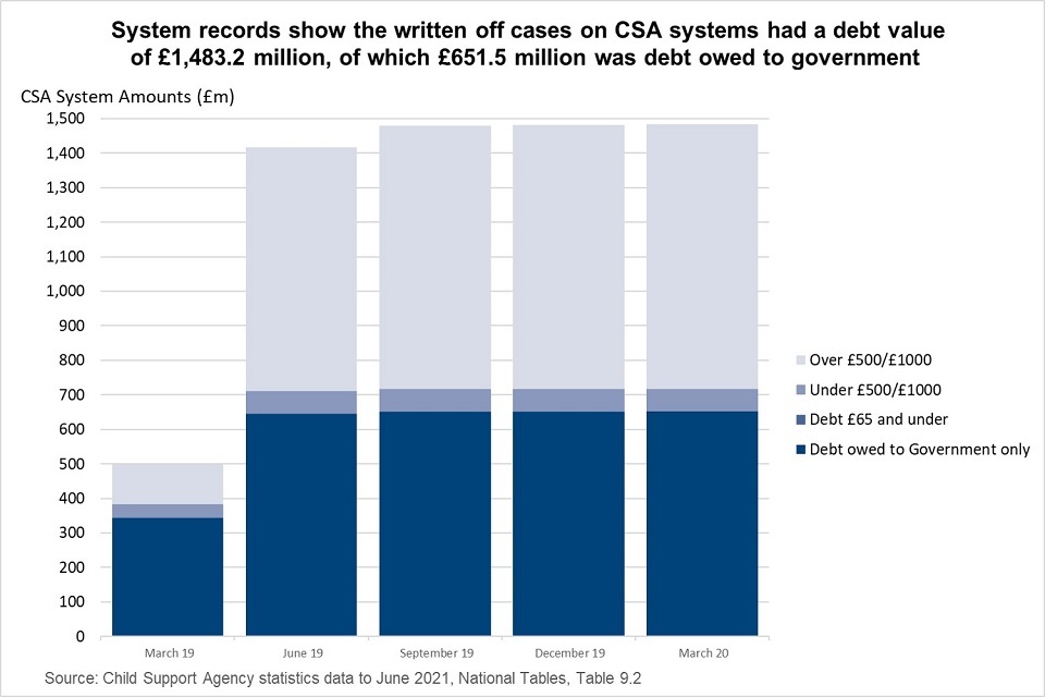Approximately £340 million of government debt was written off prior to the introduction of the Compliance and Arrears Strategy during the CSA case closure programme because regulations were not required to write this debt off. This debt amount is not reported in this publication because it was included in the reduction of arrears balance reported in the CSA case closure statistics. This reduced the amount of debt that was within scope of the Compliance and Arrears Strategy write-off programme.